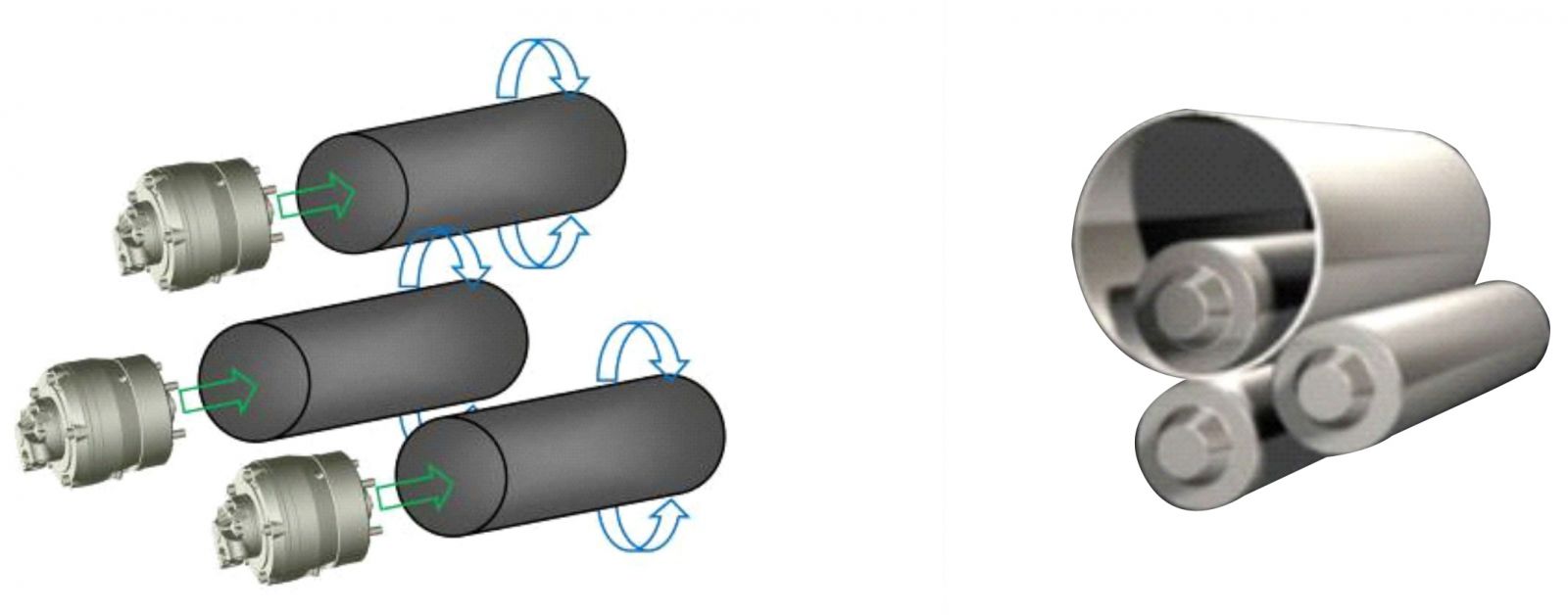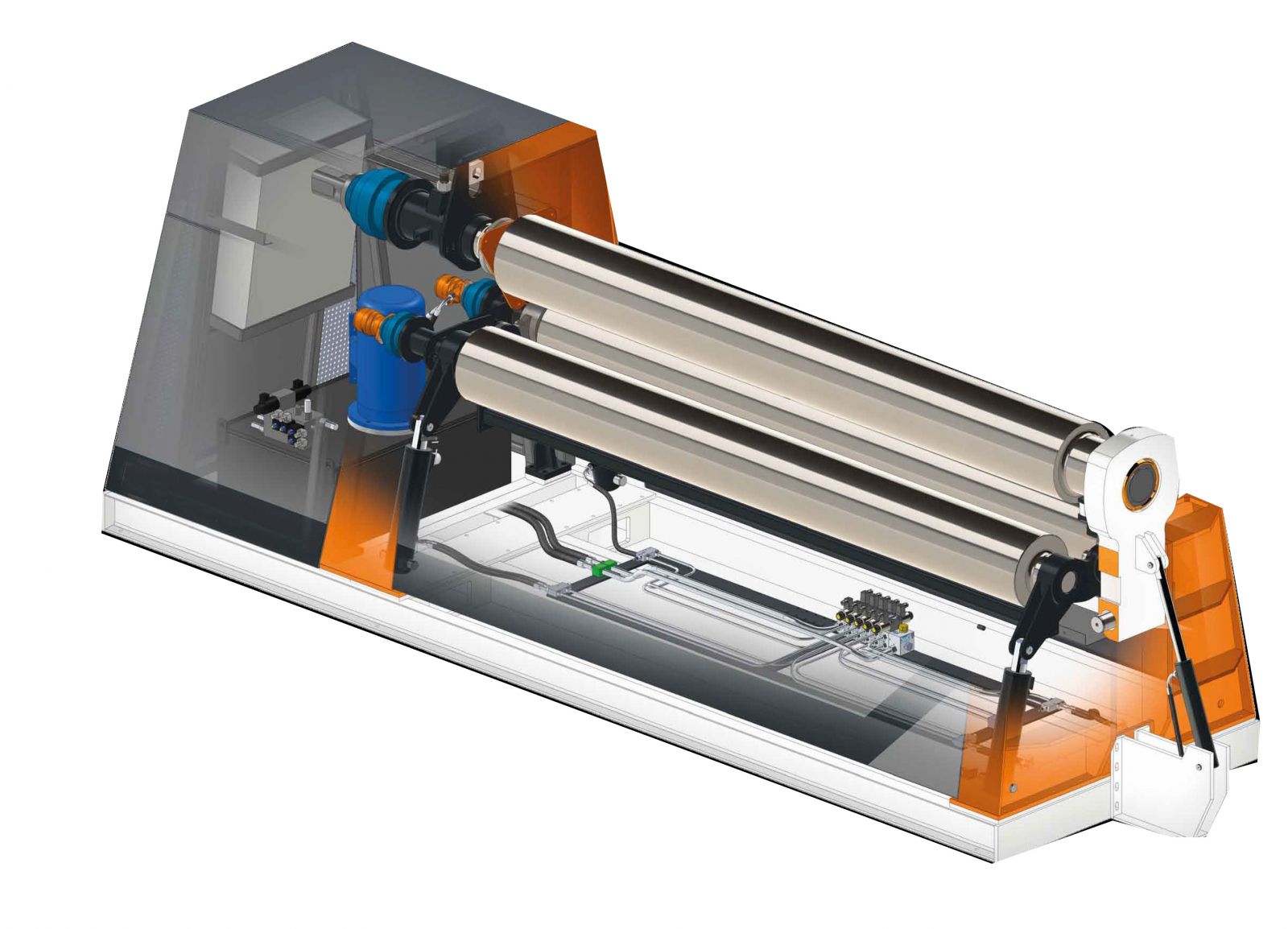 A motorização da máquina de 3 rolos é realizada por motores hidráulicos, montados diretamente nos eixos dos rolos, com redutores de alto desempenho, que transmitem a máxima potência. Um motor elétrico aciona a bomba hidráulica, que direciona o óleo para os motores hidráulicos e aciona os redutores epicicloides, que estão diretamente acoplados ao rolo e o movimentam. Todo o sistema é hidráulico, sem nenhuma parte mecânica, obtendo maior eficiência energética do que com um sistema de transmissão mecânica.