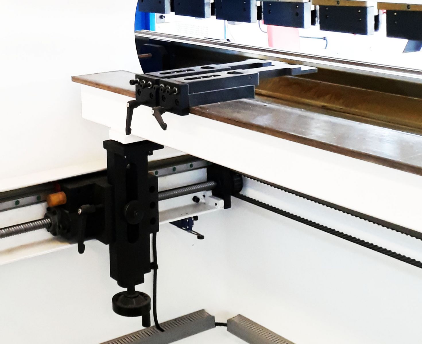 O sistema de batente traseiro de chapa metálica consiste em movimentos automatizados e motorizados no eixo X, através do controlador E21, e movimentos manuais de altura (eixo R) e transversal (eixo Z). Devido à sua grande versatilidade, o batente traseiro adapta-se a qualquer tipo e formato de perfil a ser dobrado.