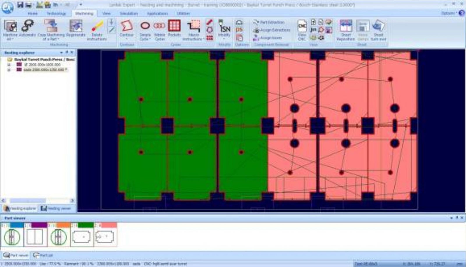 Sistema CNC AUTO NESTING. Com processamento automático de arquivos CAD. Ferramentas de gerenciamento de biblioteca e diversos recursos, como otimização de offset de punção, processamento automático de microjuntas e muito mais.